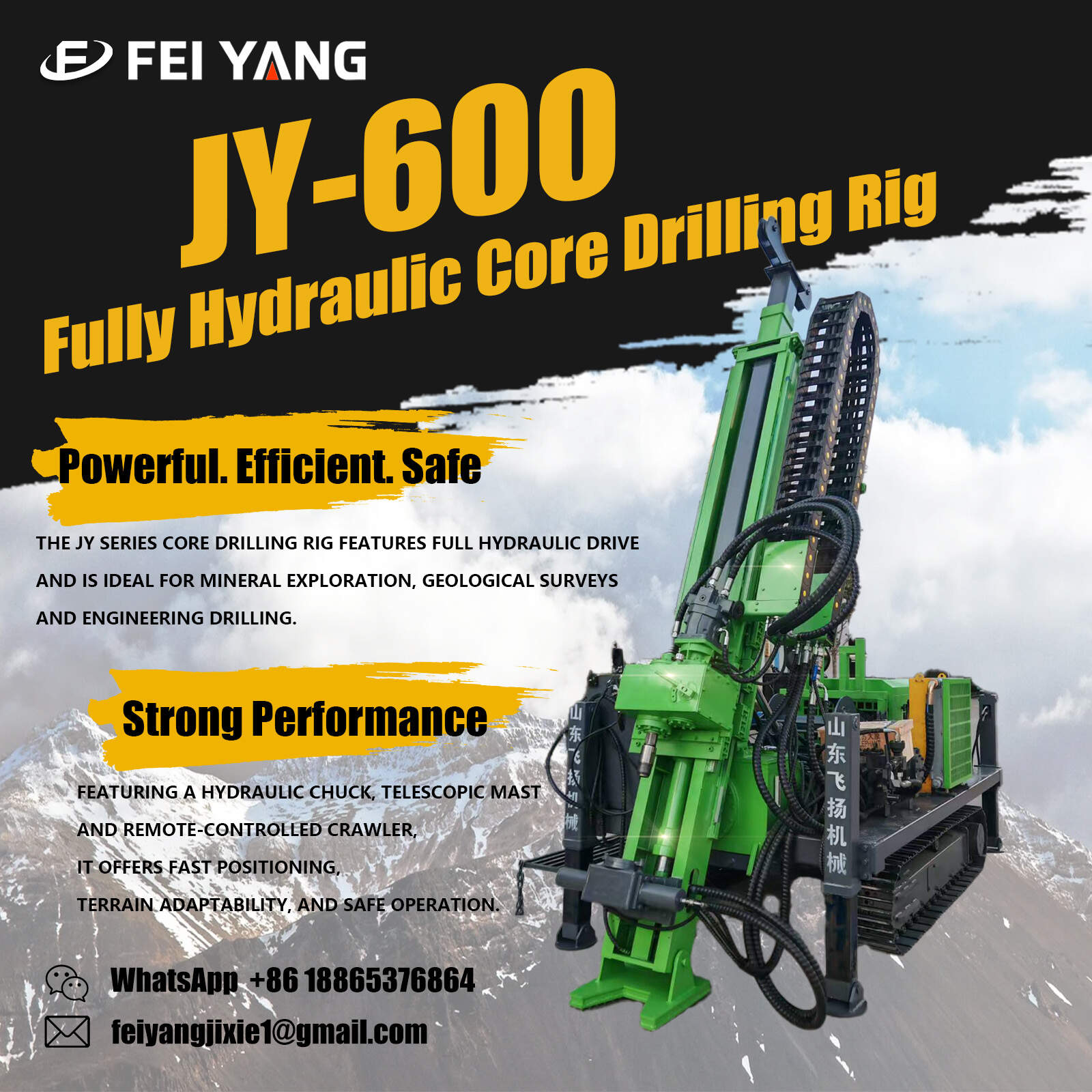 Shandong Feiyang Machinery Group co.,ltd was established in 2015. located in the beautiful hometown of Confucius and Mencius --- Jining city.Shandong province.China.which is a professional manufacturer and exporter of all kind of drilling rigs machine with more than 10 years' experience in geological prospecting machinery and equipment and tools.drilling rigs and accessories area.
